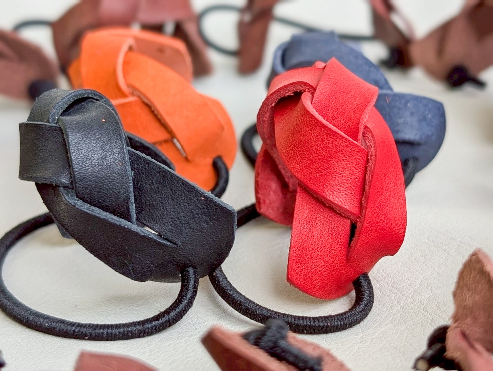 アクセサリー感覚で楽しめる、レザーのヘアゴムです。